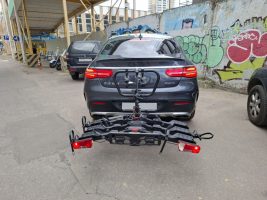 Данная модель требует сборки перед эксплуатацией. Установка на шар фаркопа осуществляется за считанные минуты. Велокрепления включают в себя натяжитель, предотвращающий раскачивание. Для затяжки обычно достаточно 2–3 оборотов.