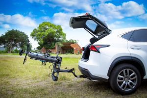 Система защиты переднего колеса от колебаний: эта функция предназначена для предотвращения слишком сильного смещения переднего колеса во время транспортировки. Функция наклона позволяет получить доступ к багажнику автомобиля даже с установленными велосипедами — регулятор наклона находится над номерным знаком.