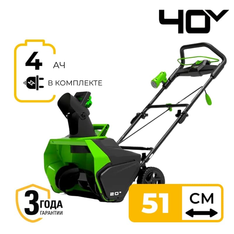 Снегоуборщик Greenworks GD40SB 40V для очистки придомовой территории от снега. Имеет ширину захвата 51 см, глубину захвата 20 см, скорость вращения 1900 об/мин.