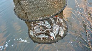 Плотва. Эта рыба сбивается в большие стаи и кормится до самого ледостава. Искать её нужно на глубине 3-5 метров со спокойным течением, рядом с ямами. В ход идут зимние или болонские удочки с чувствительной оснасткой. Насадка — мотыль, опарыш или «бутерброд» из них.