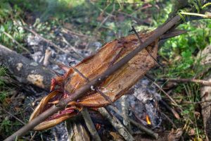 Другой способ – рыбу разрезать по брюшку или спинке, выпотрошить и распластать как камбалу. Натереть солью у специями, нанизать на деревянную рогатку – и так же готовить на огне. Так она равномернее и быстрее прожарится.