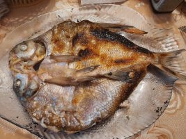 Другой способ – рыбу разрезать по брюшку или спинке, выпотрошить и распластать как камбалу. Натереть солью у специями, нанизать на деревянную рогатку – и так же готовить на огне. Так она равномернее и быстрее прожарится.