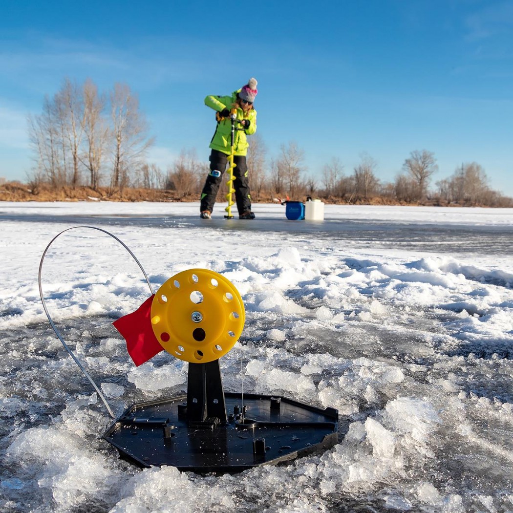 Конструкция жерлиц способствует затемнению лунки площадкой-основанием, рыба спокойнее подходит не боясь яркого света. Яркая расцветка катушки и флажка помогает быстро увидеть сработку в зимних условиях.